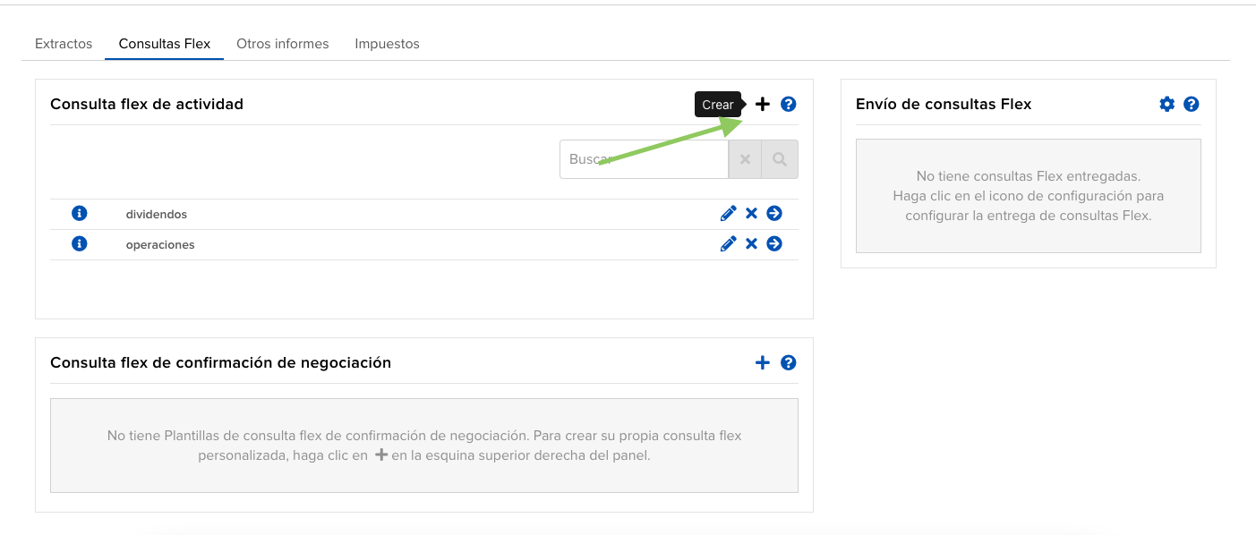 En la web de IBKR (Client Portal), entra en Informes → Consultas Flex. En la sección Consulta flex de actividad, pulsa el botón + de la esquina derecha para crear una nueva.