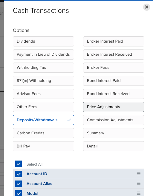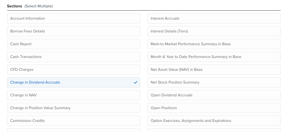 Esta vez marca solo Modificación dividendos devengados (en inglés Change in Dividend Accruals). En el modal, pulsa SELECCIONAR TODO y guarda.