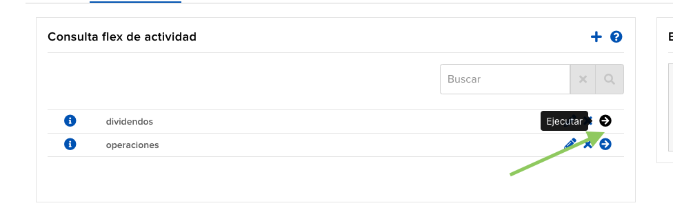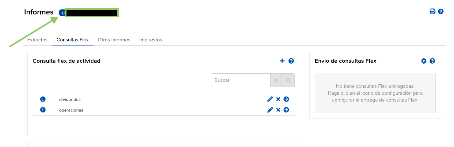 IBKR genera tus informes a través de Consultas Flex: configuras qué datos quieres una sola vez y luego ejecutas la consulta siempre que necesites un CSV. Tendrás que crear tres consultas: una para Operaciones, otra para Dividendos y otra para Movimientos de efectivo.