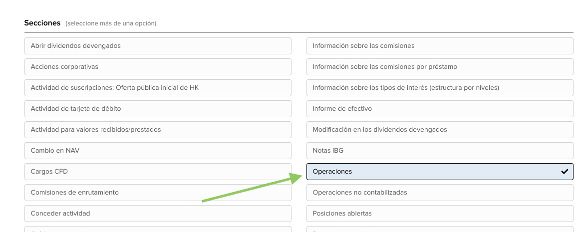 Pon un nombre a la consulta (por ejemplo operaciones) y, en el listado de secciones, marca únicamente Operaciones (o Trades si tu cuenta está en inglés). En el modal que se abre, pulsa SELECCIONAR TODO y guarda.