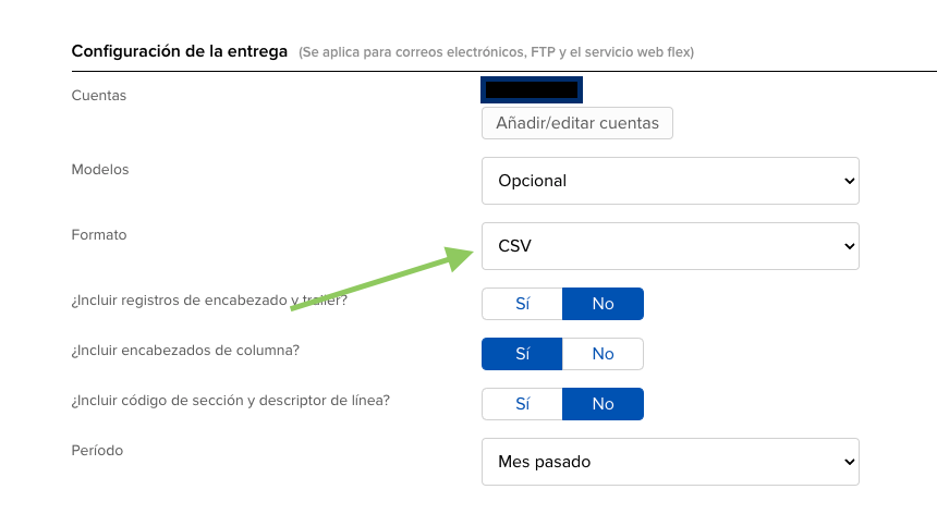 Baja hasta Configuración de la entrega y cambia el Formato a CSV. Deja el resto de opciones por defecto, pulsa Continuar, revisa el resumen y confirma con Crear y Aceptar.