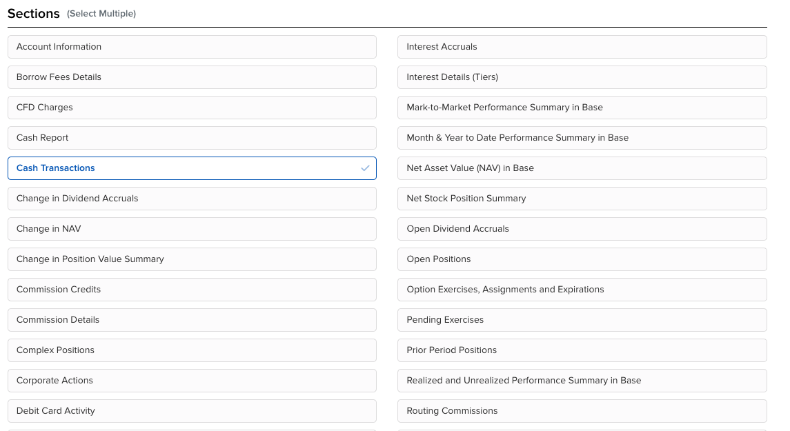 En el modal que se abre, marca Deposits/Withdrawals. Si también te interesa importar intereses, marca Broker Interest Paid, Broker Interest Received y Withholding Tax. Pulsa Select All en las cabeceras y guarda.